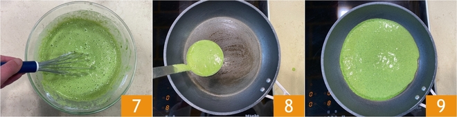 Mélangez encore avec le fouet pour l'absorber complètement 7. Maintenant, chauffez bien une poêle antiadhésive de 22 cm de diamètre et graissez-la avec l'huile, puis versez une louche de pâte au centre 8 et bougez la poêle pour la répartir uniformément 9.