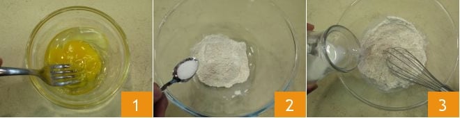 Pour réaliser les crêpes complètes aux figues et poires, commencez par préparer la pâte à crêpes : battez l'œuf dans un petit bol 1 et dans un autre, faites fondre le beurre ; dans un autre grand bol, mettez la farine complète et le sel 2, puis versez le lait à température ambiante en filet 3, en mélangeant avec un fouet pour éviter les grumeaux.