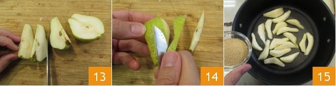 Coupez les poires en quartiers 13 et épluchez-les 14. Placez les quartiers de poire dans une casserole, ajoutez le sucre de canne 15