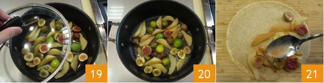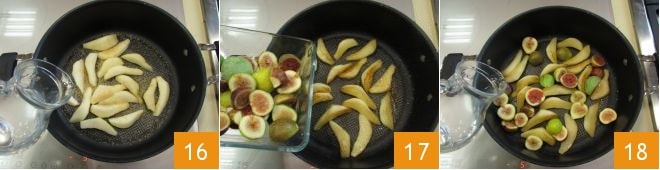 et la moitié de l'eau 16, laissez dorer les poires pendant 5 minutes ou le temps nécessaire pour qu'elles prennent de la couleur. À ce stade, ajoutez les figues 17 et le reste de l'eau 18,