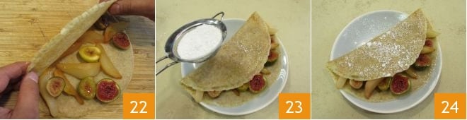 puis repliez l'autre moitié de la crêpe sur la garniture 22 et garnissez de sucre glace 23. Servez immédiatement les crêpes complètes aux figues et poires 24 !