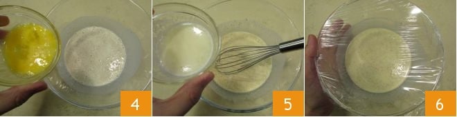 Une fois le lait absorbé, ajoutez l'œuf battu 4 et le beurre fondu à température ambiante 5 et mélangez toujours avec le fouet pour obtenir une pâte homogène. Couvrez avec un film plastique 6 et laissez reposer au réfrigérateur pendant 30 minutes. Pour plus d'indications, vous pouvez consulter la recette des crêpes complètes sur notre site.