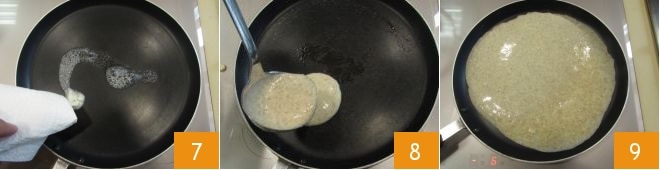 Chauffez une crêpière ou une petite poêle antiadhésive d'environ 20 cm de diamètre, enduisez la poêle d'un peu de beurre 7 et versez une louche de pâte 8. Inclinez la poêle pour répartir uniformément le mélange et faites cuire pendant 3 minutes d'un côté 9
