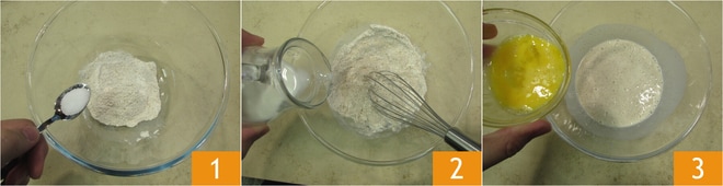 Pour réaliser les crêpes complètes mascarpone et champignons, versez la farine dans un bol, ajoutez le sel 1, le poivre et versez le lait en battant avec un fouet 2. Incorporez également l'œuf 3