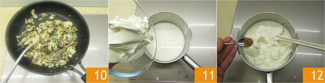 Éliminez l'ail et réservez 10. Préparez la sauce au mascarpone. Dans une petite casserole, versez le lait et le mascarpone 11, chauffez à feu doux. Salez, poivrez et parfumez avec une belle râpée de noix de muscade 12.