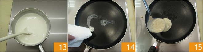 Une fois une sauce homogène obtenue 13, éteignez et réservez. Maintenant, chauffez une crêpière ou une petite poêle antiadhésive d'environ 20 cm de diamètre, graissez le fond avec un peu de beurre 14 et versez une louche de pâte 15.