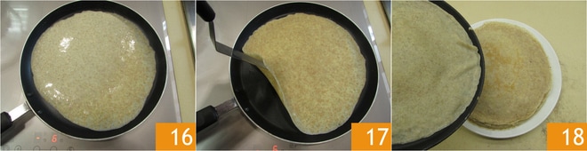 Inclinez la poêle pour permettre au mélange de se répartir uniformément sur le fond 16 et faites cuire pendant 3 minutes d'un côté et deux minutes de l'autre 17. Terminez de cuire toutes les crêpes et empilez-les sur une assiette 18.