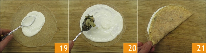 Maintenant, garnissez chaque crêpe avec deux cuillères de sauce 19 et les champignons 20. Pliez la crêpe 21