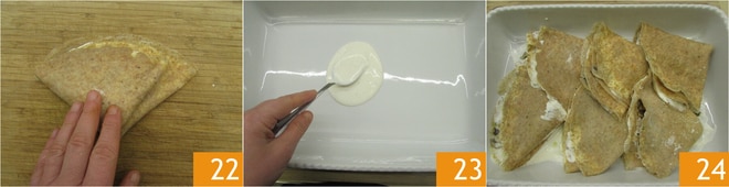 Et puis pliez-la encore en deux, obtenant un éventail 22. Prenez un plat allant au four, étalez une couche de sauce au mascarpone sur le fond 23, disposez les crêpes 24.