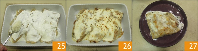 Versez le reste de la sauce par-dessus et saupoudrez de fromage râpé 25. Faites cuire au four statique à 200° pendant 10 minutes, puis passez au grill pendant 2-3 minutes pour bien dorer la surface. Les crêpes complètes mascarpone et champignons sont prêtes, sortez-les du four 26 et servez-les bien chaudes 27.