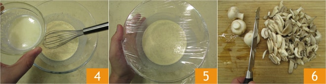 et le beurre fondu à température ambiante 4, mélangez toujours avec le fouet pour obtenir une pâte homogène et sans grumeaux. Couvrez le bol avec du film plastique 5 et laissez reposer au réfrigérateur pendant 30 minutes. Pendant ce temps, nettoyez les champignons : éliminez la base terreuse et enlevez les impuretés avec un chiffon humide. Tranchez les champignons 6.