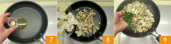 Dans une poêle, versez l'ail et l'huile 7, chauffez et ajoutez les champignons 8. Faites cuire pendant environ 5-6 minutes en salant et poivrant. En fin de cuisson, ajoutez le persil 9.