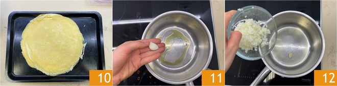 Au fur et à mesure qu'elles cuisent, empilez les crêpes sur un plateau et couvrez-les avec du film plastique ou un torchon 10. Préparez entre-temps aussi la sauce : pelez et hachez l'oignon. Dans une casserole, ajoutez un filet d'huile, une gousse d'ail 11 et l'oignon haché 12.