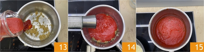 Laissez mijoter à feu doux pendant environ 10 minutes, puis ajoutez la sauce tomate 13, salez 14 et poursuivez la cuisson à feu moyen-doux pendant environ 30 minutes. À la fin de la cuisson 15, rectifiez l'assaisonnement, parfumez avec les feuilles de basilic et retirez l'ail.