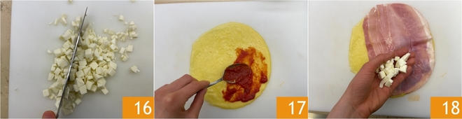 Coupez la mozzarella pour pizza en petits cubes 16. Vous êtes prêts à garnir les crêpes : assaisonnez la première crêpe à moitié avec la sauce, puis ajoutez une tranche de jambon et des cubes de mozzarella 18.