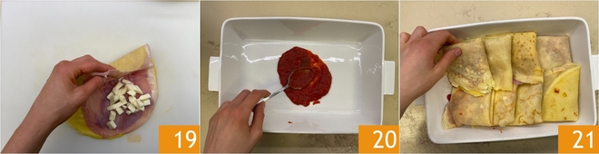 Pliquez la crêpe en deux 19 puis à nouveau en deux, de manière à obtenir un triangle. Maintenant, parsemez le fond d'un plat allant au four avec quelques cuillères de sauce 20 et disposez les crêpes repliées à l'intérieur, au fur et à mesure que vous les garnissez 21.