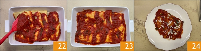Couvrez avec le reste de la sauce 22 et enfournez dans un four statique préchauffé à 200° pour environ 15 minutes. Une fois le temps de cuisson écoulé, sortez-les du four 23 et dressez-les. Complétez avec la ricotta salée râpée et vos crêpes de Noël sont prêtes à être servies 24 !