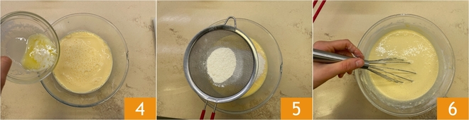 Versez ensuite 25 g de beurre fondu tiède (les 10 g restants serviront pour la cuisson) 4, mélangez et ajoutez aussi la farine tamisée 5. Amalgamez avec le fouet jusqu'à obtenir une pâte lisse et homogène 6.