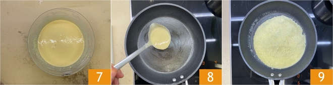 Couvrez la pâte avec un film plastique et laissez reposer au réfrigérateur pendant 10 minutes 7. Chauffez une crêpière, ajoutez un morceau de beurre et laissez-le fondre, puis étalez-le bien sur toute la surface avec un pinceau ou une feuille de papier absorbant. Versez une louche de préparation au centre de la poêle 8 et répartissez la pâte uniformément. Faites cuire une minute de chaque côté à feu moyen 9.