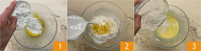 Pour préparer les crêpes aux châtaignes farcies de ricotta et de champignons, commencez par casser les œufs dans un bol, ajoutez une pincée de sel et battez rapidement avec un fouet. Ajoutez la farine 00 1 et la moitié de la quantité de lait 2. Mélangez jusqu'à incorporation complète de la farine. Ajoutez ensuite la farine de châtaignes 3.