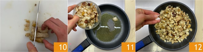 Passez maintenant à la préparation de la farce. Nettoyez les champignons et coupez-les en dés 10. Dans une poêle, versez un filet d'huile, ajoutez l'ail et faites-le revenir quelques minutes. Lorsque l'ail est doré, ajoutez les champignons 11 et rectifiez le sel 12.
