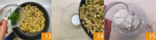 Ajoutez également le persil haché 13 et laissez cuire 5 à 7 minutes, jusqu'à ce que les champignons soient tendres. Dans un bol, mettez la ricotta, ajoutez les champignons 14, le parmesan râpé 15, le poivre et rectifiez le sel si nécessaire.