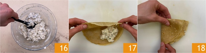 Mélangez jusqu'à obtenir un mélange homogène 16. Mettez une cuillère de farce à l'intérieur d'une crêpe, puis pliez-la en deux 17 et encore en deux, obtenant ainsi une forme triangulaire 18. Répétez la même procédure jusqu'à épuisement des crêpes.