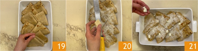 Huilez un plat allant au four et disposez-y vos crêpes 19. Saupoudrez la surface de parmesan râpé 20 et ajoutez des petits dés de beurre 21.