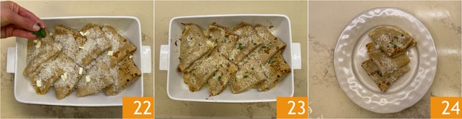 Complétez avec du persil haché 22 et faites cuire au four statique à 220°C pendant 10 à 15 minutes, jusqu'à ce qu'elles commencent à gratiner 23. Dressez vos crêpes aux châtaignes farcies de ricotta et de champignons 24 et servez aussitôt!