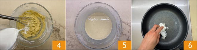 Versez le reste du lait 4 et mélangez jusqu'à obtenir une pâte lisse et sans grumeaux 5. Laissez reposer 30 minutes au réfrigérateur, couvert de film plastique. Chauffez une poêle antiadhésive et graissez légèrement avec du beurre 6.