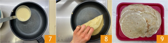 Versez une louche de pâte dans la poêle 7 et laissez cuire 1 à 2 minutes, jusqu'à ce que la pâte soit dorée 8, puis retournez-la et cuisez l'autre côté. Répétez la même procédure jusqu'à épuisement de la pâte. Placez les crêpes dans une assiette 9 et mettez de côté.