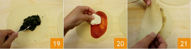 Garnissez les crescioni avec les différentes garnitures, en disposant la garniture sur une moitié du disque, en prenant soin de laisser au moins 1 cm du bord : assaisonnez 4 disques avec les herbes 19, 4 avec le tomate et mozzarella 20 et les 4 autres avec saucisse et pommes de terre. Ensuite, badigeonnez les bords avec un peu d'eau et refermez les disques en demi-lune 21.