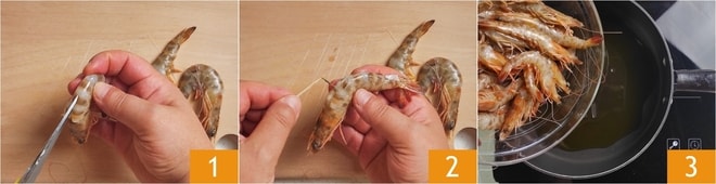 Pour réaliser les crevettes à la poêle, commencez par retirer l’intestin des crustacés en coupant la carapace sur le dos 1 et en l'extrayant délicatement à l'aide d'un cure-dent 2. Il n'est pas nécessaire de retirer la carapace, la tête et les pattes. Chauffez l'huile dans une poêle et faites dorer les crevettes pendant 2-3 minutes 3.