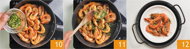 Ajoutez la gremolata aux crevettes 10 et faites revenir encore pendant quelques minutes pour bien les enrober 11. Éteignez le feu et servez immédiatement vos crevettes à la poêle 12 !