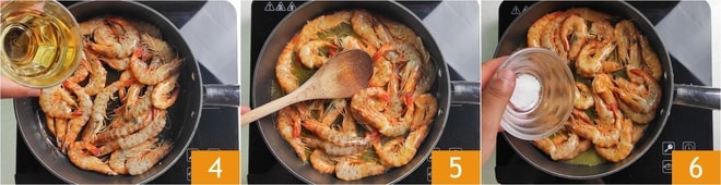 Quand elles sont bien dorées, déglacez avec le vin blanc 4 et laissez évaporer complètement l'alcool 5, puis assaisonnez avec du sel 6. Baissez le feu et faites cuire pendant environ 5 minutes, en remuant de temps en temps.