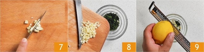 Pendant ce temps, préparez la gremolata : hachez finement les gousses d'ail 7, puis ajoutez-les au persil haché 8 avec le zeste de citron râpé 9. Mélangez bien.