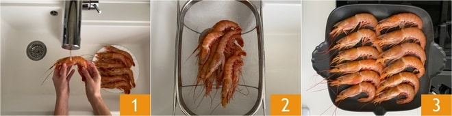 Pour préparer les crevettes grillées, commencez par les rincer sous l'eau pendant quelques secondes en faisant attention à ne pas les casser 1, elles doivent rester entières, puis transférez-les dans une passoire et laissez-les égoutter 2. Chauffez une grille sur le feu, dès qu'elle est très chaude, placez les crevettes à l'intérieur 3.