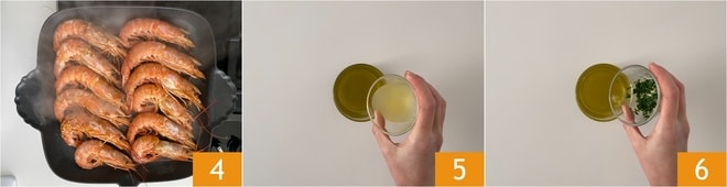 et laissez-les cuire à feu vif pendant 3 minutes, puis retournez-les 4 et continuez la cuisson pendant encore 3 minutes. Pendant ce temps, préparez l'assaisonnement. Dans un petit bol, versez l'huile, le jus de citron 5 et le persil haché 6.