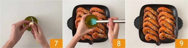 Ajoutez l'ail coupé en petits morceaux 7 et mélangez. Une fois la cuisson terminée, salez les crevettes. Utilisez une partie de l'assaisonnement pour badigeonner les crevettes 8, elles seront plus brillantes et savoureuses 9. Servez les crevettes grillées avec l'assaisonnement restant.