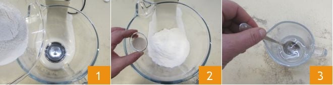 Pour préparer les crispelle, commencez par tamiser la farine dans un bol en vous aidant d'une passoire à mailles très fines 1. Versez ensuite la farine dans un mixeur et ajoutez la levure 2. Pendant ce temps, prenez le sucre. Versez-le dans un récipient en verre et dissolvez-le dans de l'eau tiède pour permettre au sucre de se dissoudre 3.
