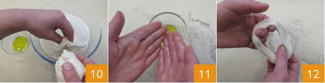 Une fois le temps écoulé pour la levée de votre pâte, prenez-la et découpez-la en petits morceaux d'environ 25-30 g chacun 10. Huilez vos mains avec 10 g d'huile 11 pour pouvoir modeler la pâte et lui donner la forme désirée 12. Nous recommandons la forme d'anneau, en prenant chaque morceau de pâte et en perçant la pâte au centre avec les doigts, puis en continuant à l'élargir.