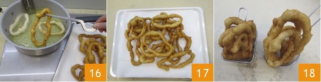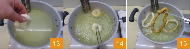 Lorsqu'elles sont frites, aidez-vous de pinces de cuisine pour les poser sur du papier absorbant afin d'éliminer l'excès d'huile 16. Répétez l'opération pour tous les anneaux que vous avez préparés 17. Lorsqu'elles auront éliminé l'excès d'huile, salez à votre goût vos crispelle et servez-les immédiatement 18.