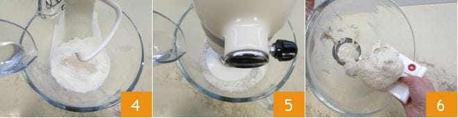 À ce stade, versez le sucre dissous dans le bol avec la farine et la levure 4 et l'eau, et en vous aidant d'un batteur sur socle et du crochet, commencez à amalgamer tous les éléments en continuant d'ajouter l'eau petit à petit 5 jusqu'à obtenir un mélange homogène où les liquides ont été absorbés 6.