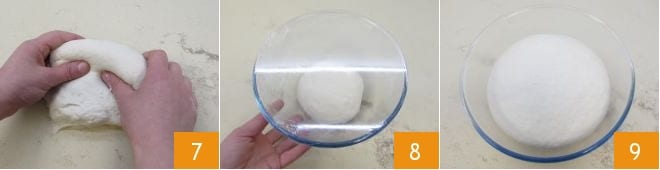 Transférez ensuite la pâte sur un plan de travail et pétrissez-la pendant au moins 10 minutes jusqu'à ce qu'elle soit bien lisse 7. Continuez à travailler la pâte jusqu'à ce que vous parveniez à obtenir une forme sphérique 8. Lorsque vous aurez obtenu une boule avec la pâte homogène, placez-la dans un bol légèrement fariné au fond pour éviter que la pâte ne colle, couvrez-la avec un film plastique alimentaire et laissez-la lever dans un endroit tiède à l’abri des courants d'air pendant au moins deux heures, ou jusqu'à ce que la pâte ait doublé de volume 9.