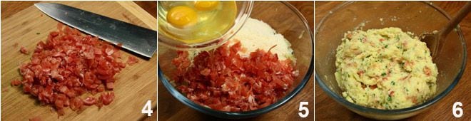Puis émincez le speck et ajoutez-le à la préparation 4, ajoutez ensuite les œufs et le Grana Padano râpé 5. Mélangez bien tous les ingrédients 6