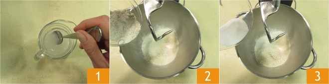 Pour préparer les croissants sans beurre, commencez par dissoudre la levure de boulanger dans de l'eau à température ambiante 1, puis réservez un moment. Dans le bol d'un robot pâtissier équipé d'un crochet, versez la farine 00, la manitoba et la farine complète 2. Ajoutez le sucre 3