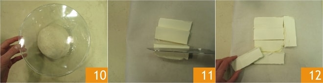 Transférez-la dans un grand bol et couvrez de film alimentaire 10. Laissez "pointer" la pâte à température ambiante pendant deux heures. Puis, après le temps de maturation à température ambiante, transférez la pâte au réfrigérateur pendant 12 heures. Pendant ce temps, préparez la margarine. Coupez-la pour obtenir 6 tranches, puis disposez-les sur une feuille de papier sulfurisé en essayant de former un carré 12.