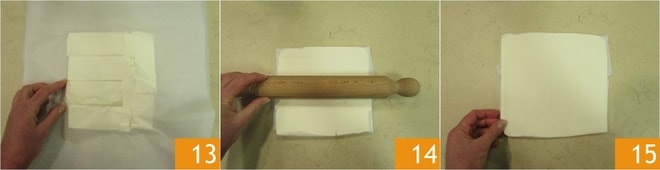 Placez une autre feuille de papier sulfurisé dessus 13 et avec un rouleau à pâtisserie, uniformisez la margarine 14 pour obtenir un carré de 18 cm, épais d'un demi-centimètre 15. Réservez ensuite au réfrigérateur jusqu'à utilisation.