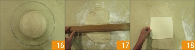 Après les 12 heures de maturation au réfrigérateur, reprenez la pâte et laissez-la à température ambiante pendant 2 heures 16. À ce stade, étalez-la sur un plan de travail légèrement fariné et étalez-la 17 jusqu'à obtenir un rectangle de 36x20 cm. Placez le carré de margarine au centre de la pâte 18.