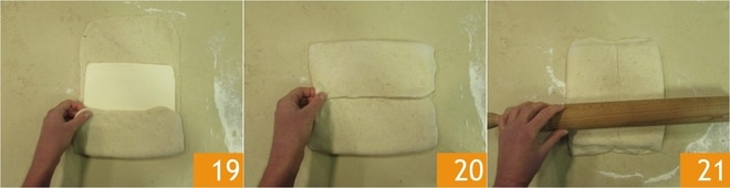 Rabattez sur le bloc de margarine le bord inférieur de la pâte 19 puis le bord supérieur, en le faisant coïncider avec l'autre 20. Scellez avec les doigts les deux côtés ouverts et étalez à nouveau la pâte 21 jusqu'à obtenir un rectangle de 50x25 cm.